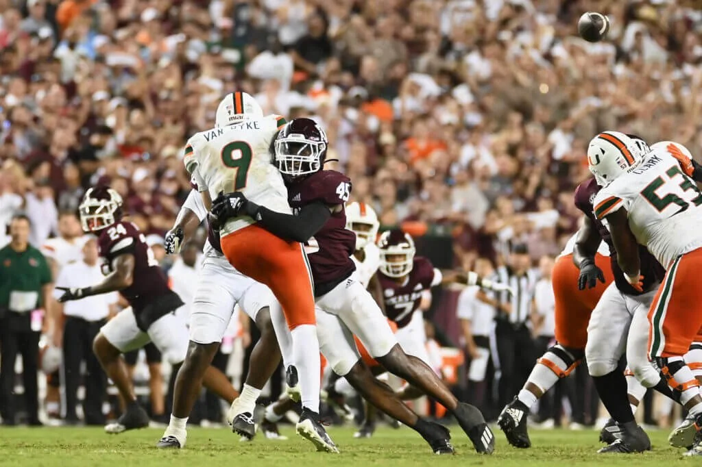 Miami QB Tyler Van Dyke averaged just 5.29 YPA in the 17-9 loss to Texas A&M. Photo Credit: Jack Gorman / Getty Images