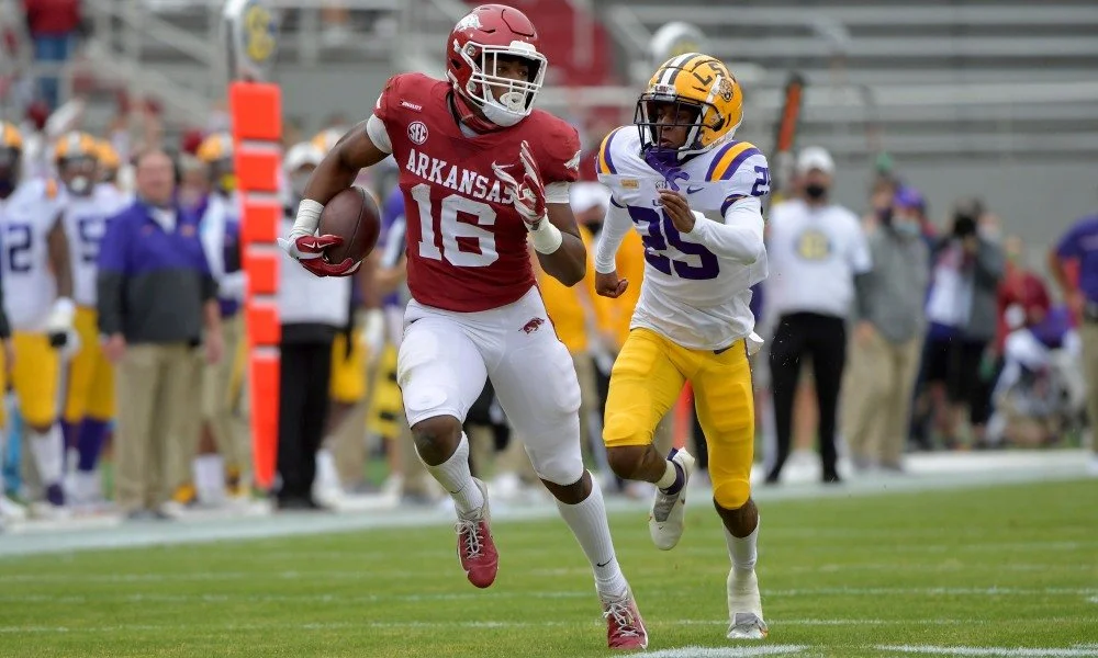 Arkansas Wide Receiver, Treylon Burks, running away from a defender not quite as fast as people thought but, still, fast enough.